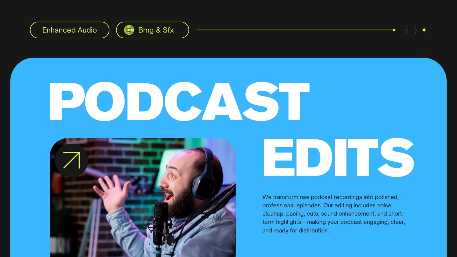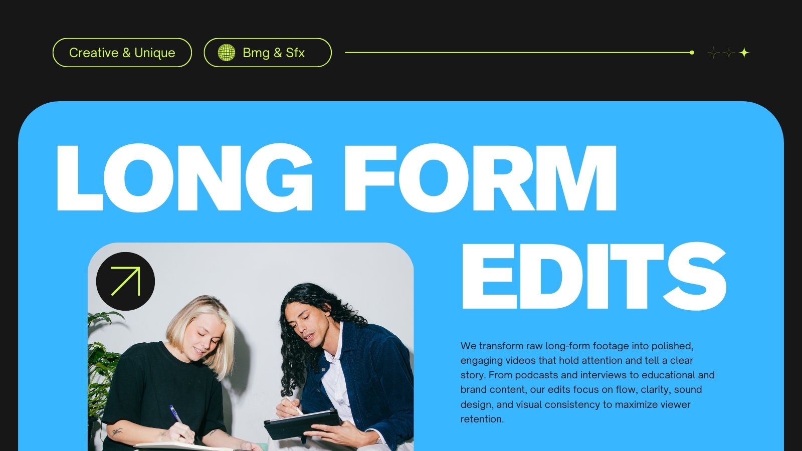 Bring your vision to life with premium, high-retention editing, captivating graphics, and flawless sound design.